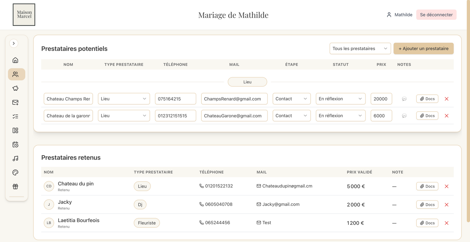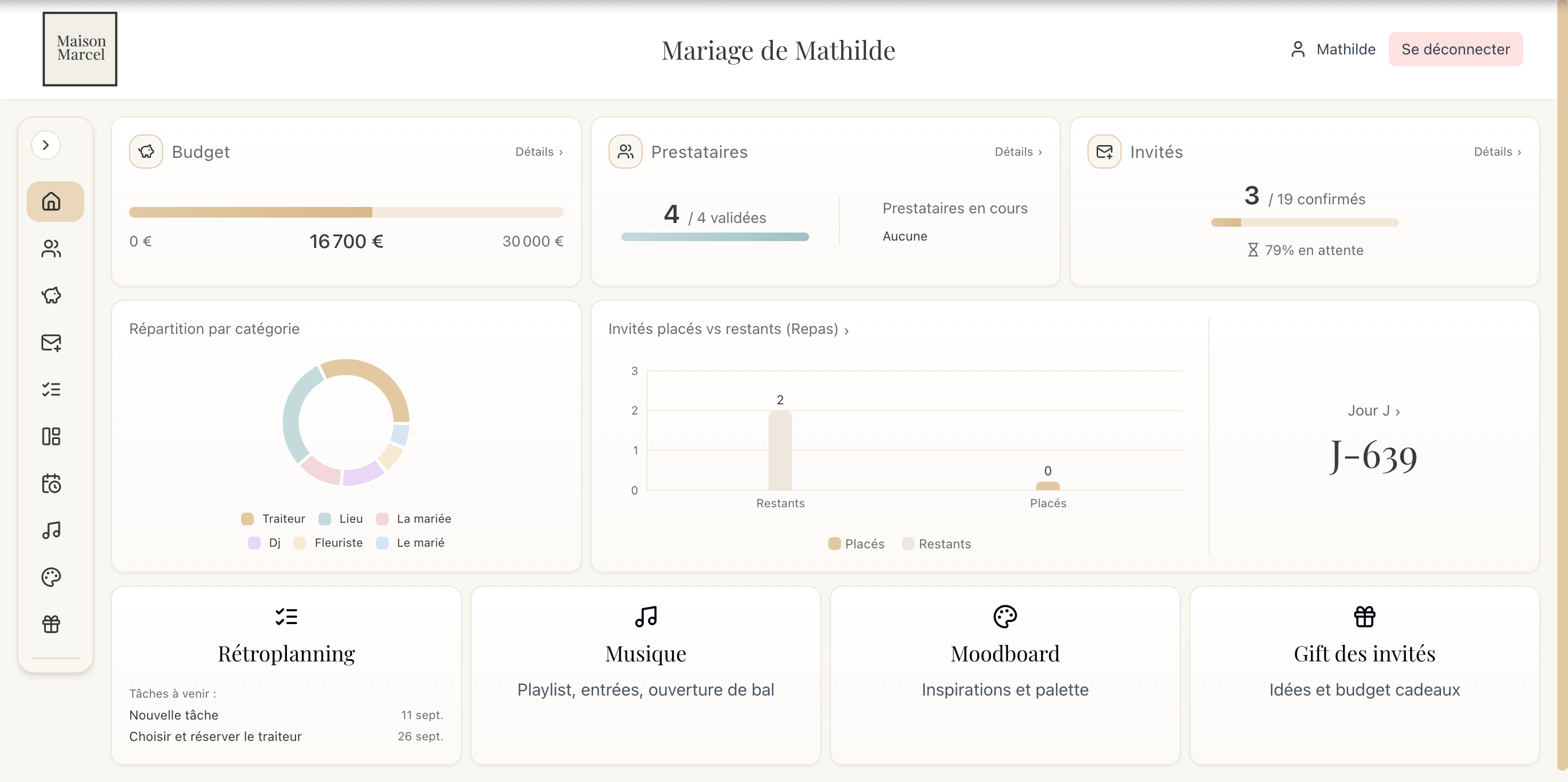 La plateforme centralise tout le nécessaire l'organisation de votre mariage. Gestion des prestataires, des invités, du plan de table, du budget, du rétroplanning, du déroulé du Jour J et bien plus encore.