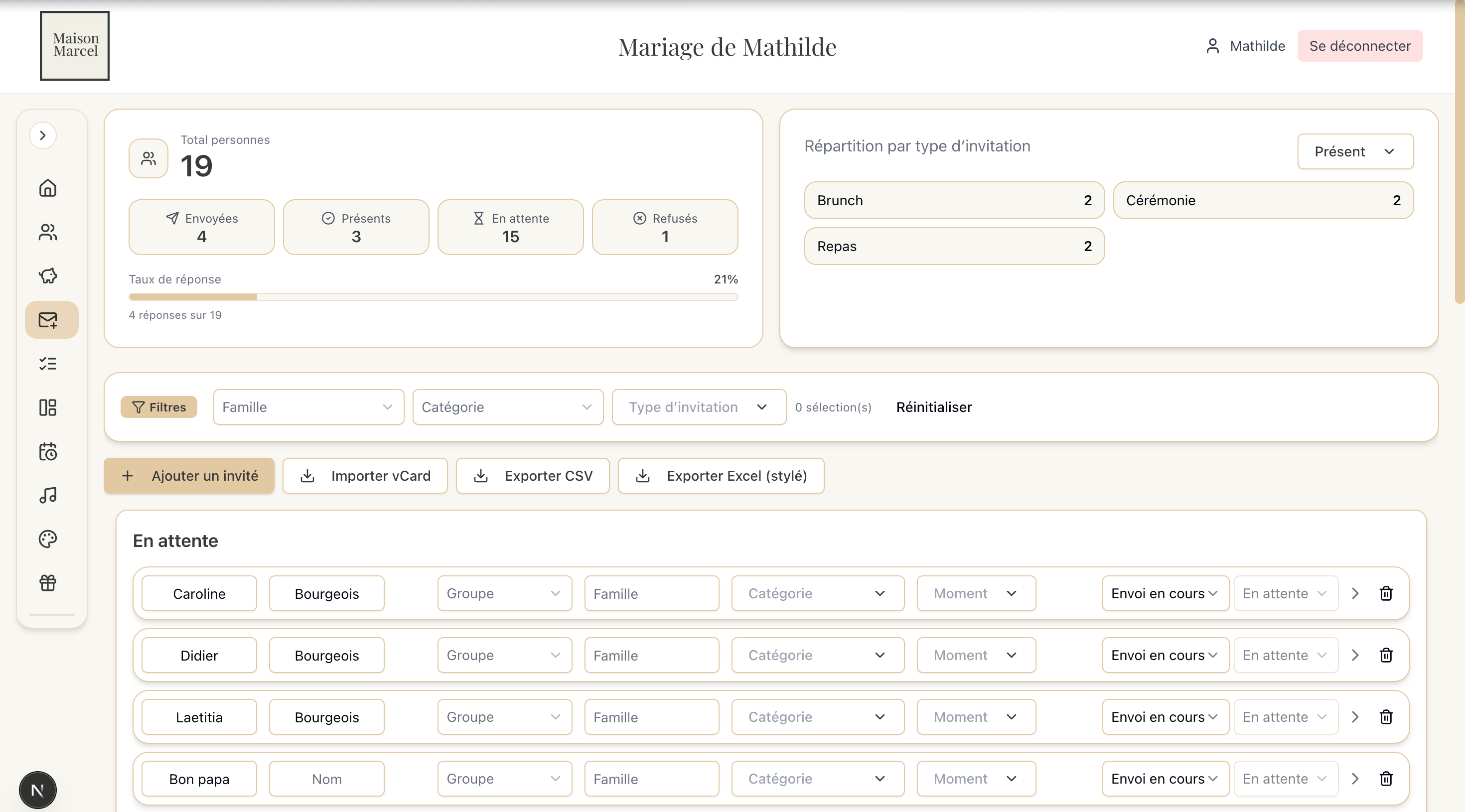 Créez facilement votre liste d’invités, envoyez-leur des RSVP directement depuis notre logiciel, et suivez les réponses et relances de chacun.